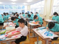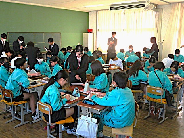 1年B組の英語の時間です。今日の英語の授業は、県総合教育センター、静東教育事務所の先生方、東部中学校の英語の先生方が来校し、研修が行われました。いろいろな表現方法を考えながら、文章を考えています。