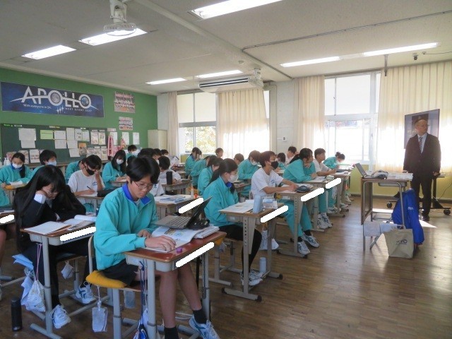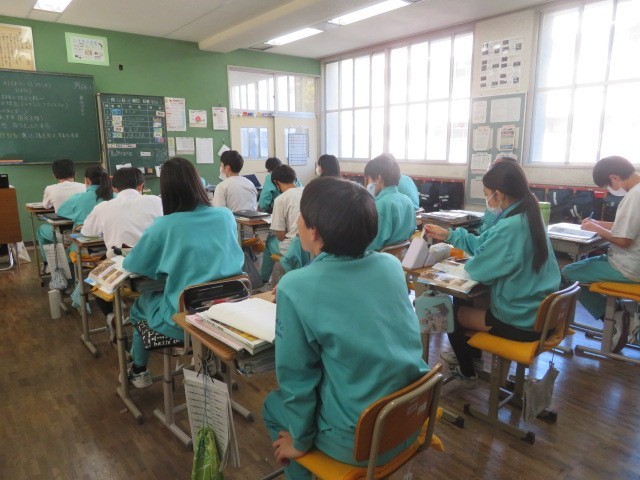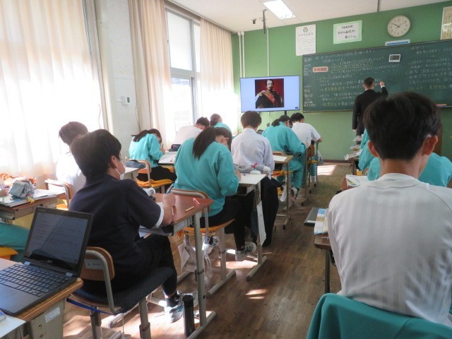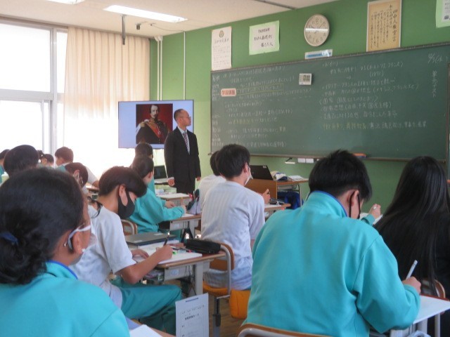 2年A組の社会の時間です。ナポレオンが遠征し、フランス革命の理念などが広がったヨーロッパの各国の変化の様子について学習しています。現代の情報社会と異なり、戦争により文化や考え方などが広められることが多かったことがわかります。