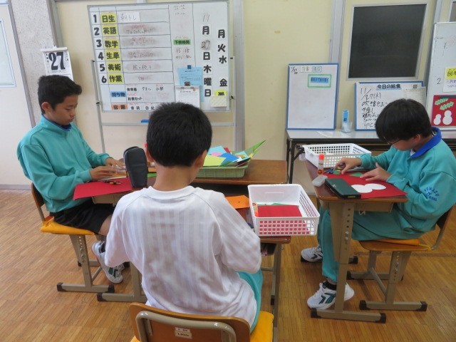E組では、コンパスを上手に使って三角形や円を作図して、色画用紙を切ったものでクリスマスカードの制作を行っていました。大きい円から小さな円、三角形の組み合わせなどを上手に行っています。