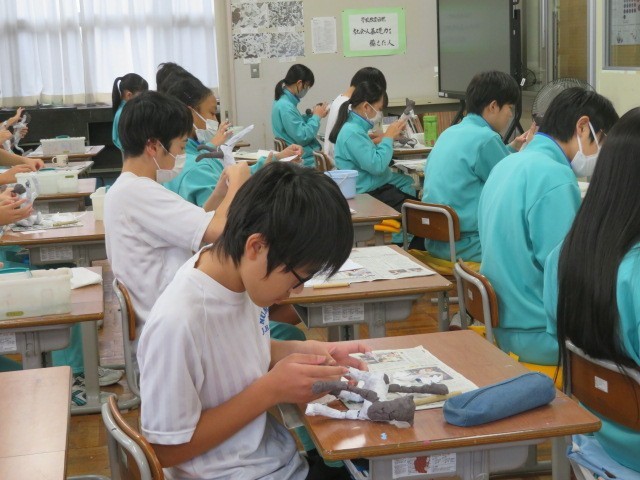 2年A組の美術の時間です。ボンドを使って丁寧に像の周りに貼っていく作業を進めています。