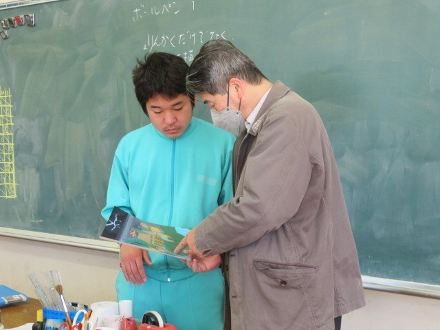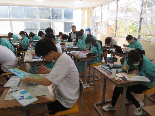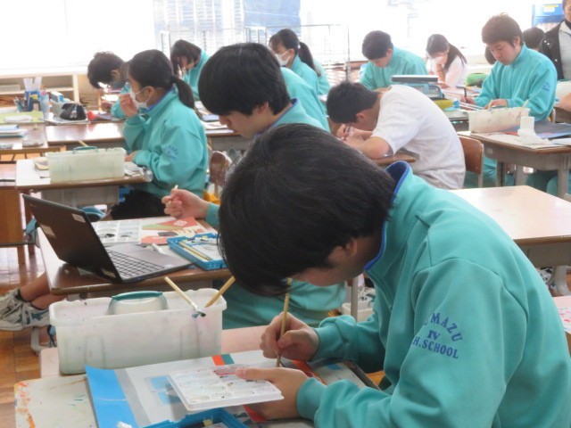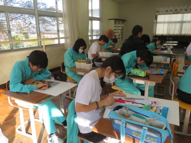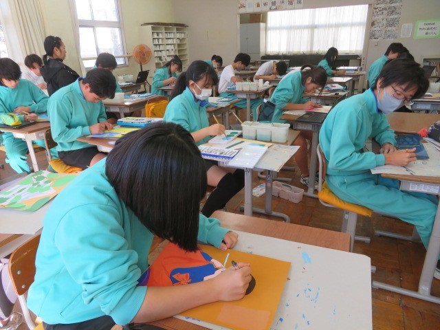 3年C組の美術の時間です。着彩も大分進んできています。皆さん丁寧に塗り上げています。
