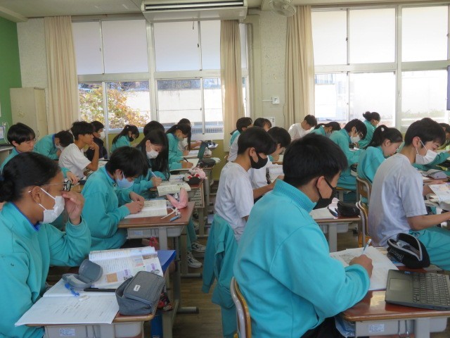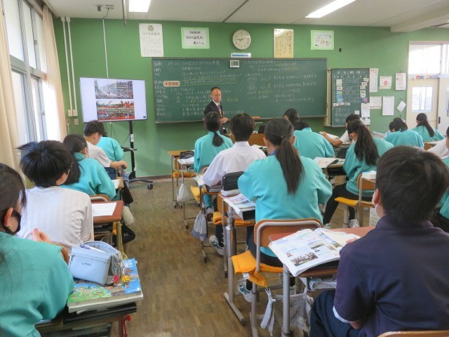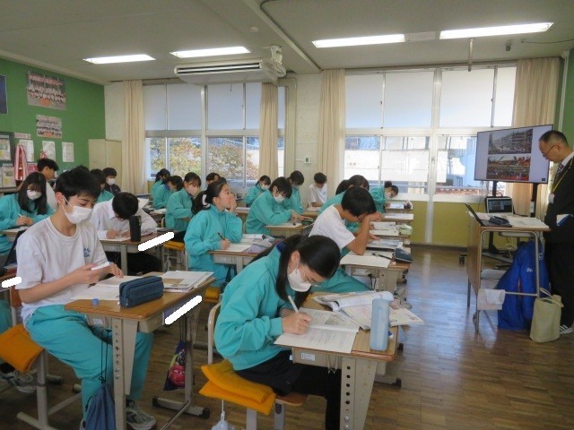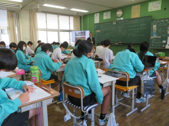 2年A組の社会の時間です。アメリカの南北戦争を中心に学習しています。アメリカ国内での対立の要因となった南部と北部の立場の違いを確認します。