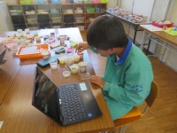 E組の様子です。ミシンを上手に使って、タオルをふきんやぞうきんに仕立てています。また、水彩絵の具をパレットにとりわけ、着彩の準備をしています。
