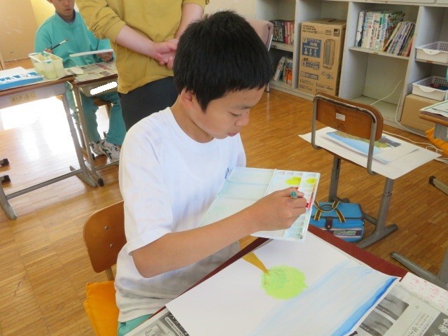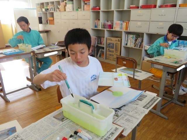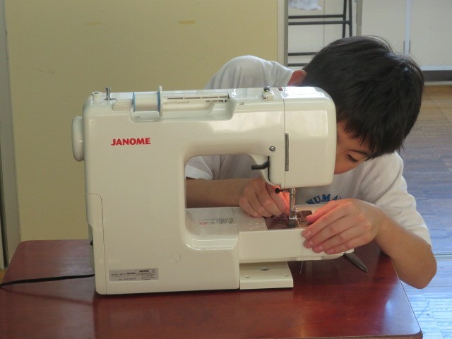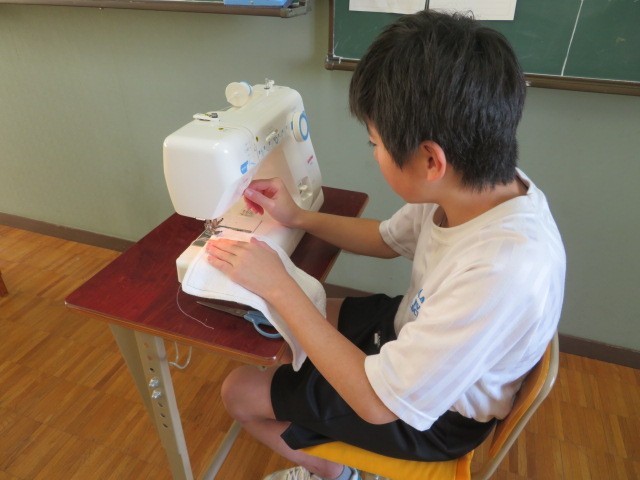 E組の様子です。ミシンを上手に使って、タオルをふきんやぞうきんに仕立てています。また、水彩絵の具をパレットにとりわけ、着彩の準備をしています。