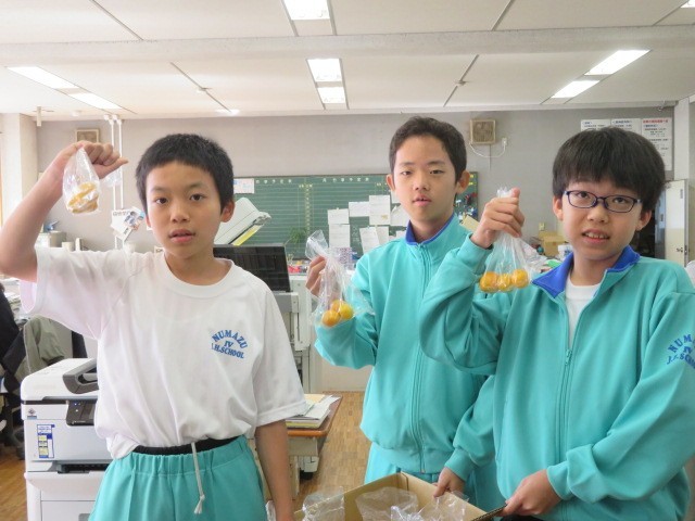 E組のみなさんが、キンカンを収穫しました。「たくさん食べると口の中がソーダのようになるよ。」と紹介してくれました。