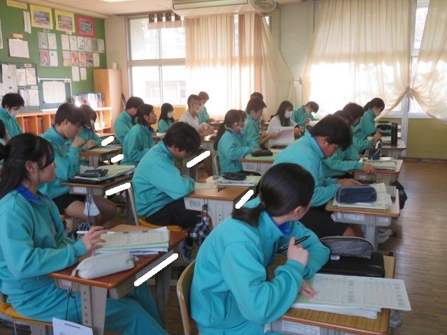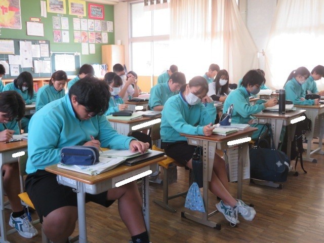 3年C組の英語の時間です。英単語のビンゴを行っていました。数字のビンゴと違い、自分のカードの単語を探すのもひと手間かかるようです。