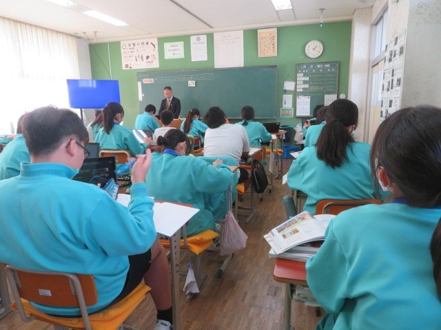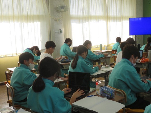 1年B組の社会の時間です。アフリカが必要とする支援について考え、調べています。