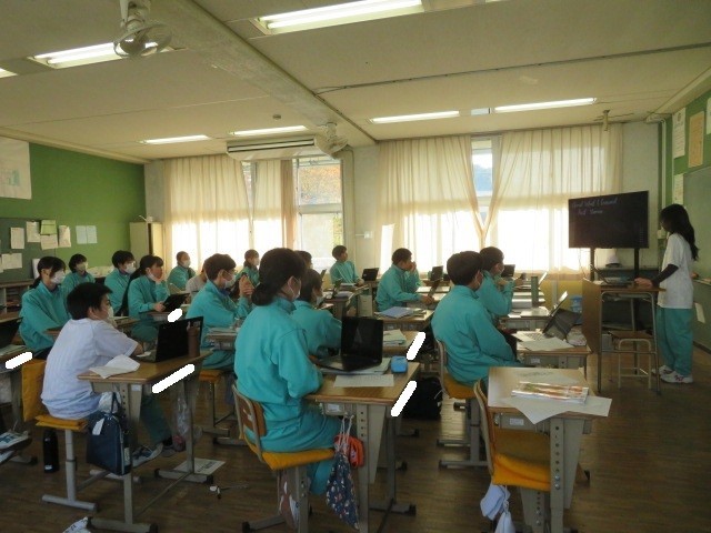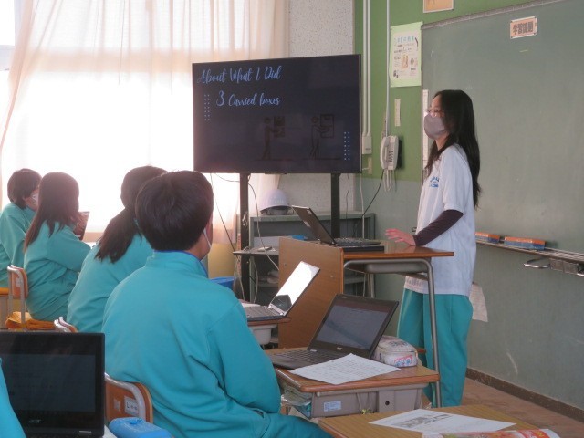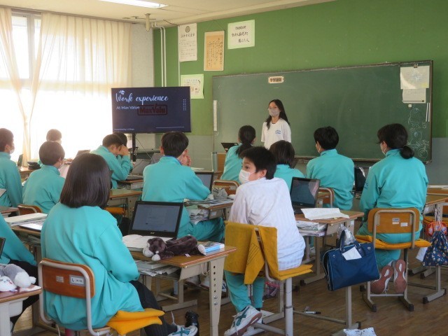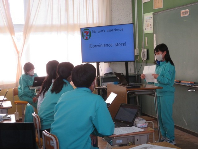 2年B組の英語の時間です。先日行った職場体験について、スピーチをしています。資料を示しながら、上手に話していました。家族にもぜひ疲労して欲しいと思います。