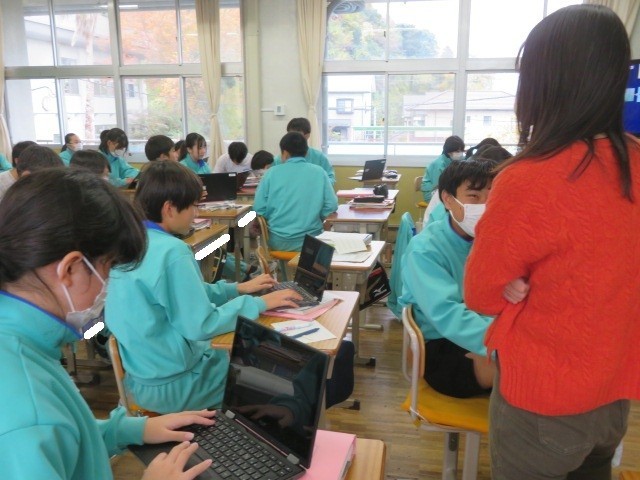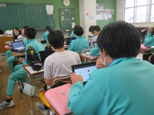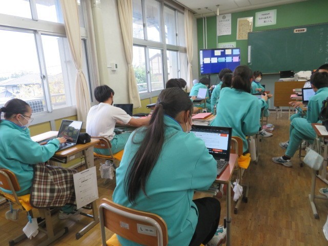 2年B組の国語の時間です。『投稿文を書こう』のテーマで、最近のニュースや身の回りの出来事などをタブレット上で関連付けて考えていきます。