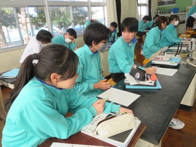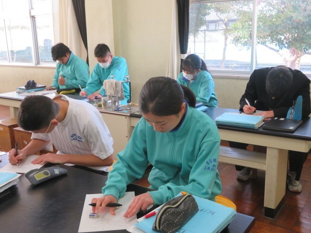 3年C組の理科の時間です。太陽を観測し、太陽についてまとめています。黒点や太陽の温度など、日常生活にはないものが出てきています。
