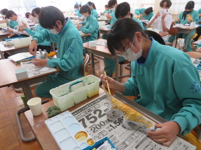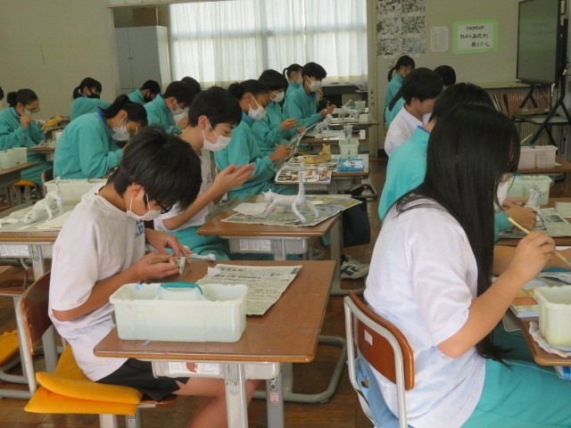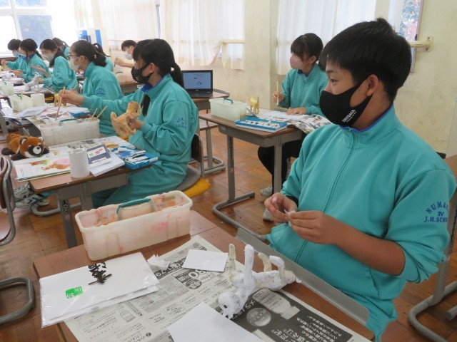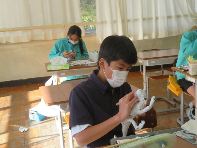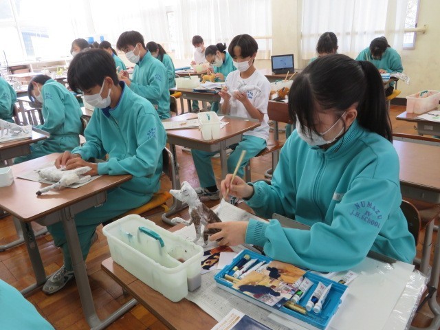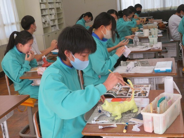 2年A組の美術の時間です。形作られた動物たちに色が塗られていきます。骨格・肉付きの姿から、着彩によりいきいきとしてきます。かわいらしい動物たちがたくさんです。