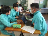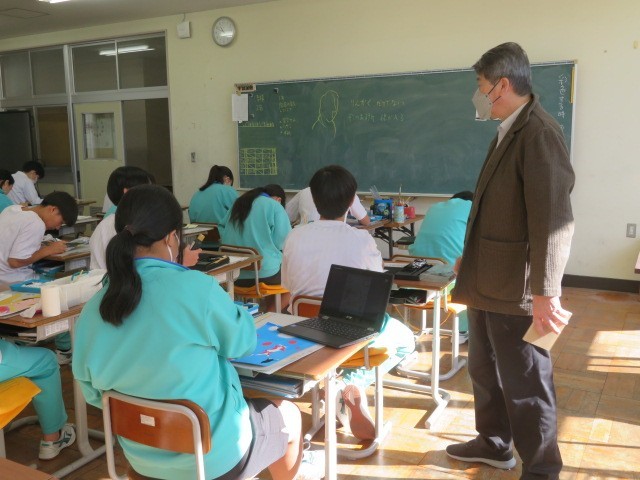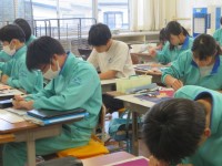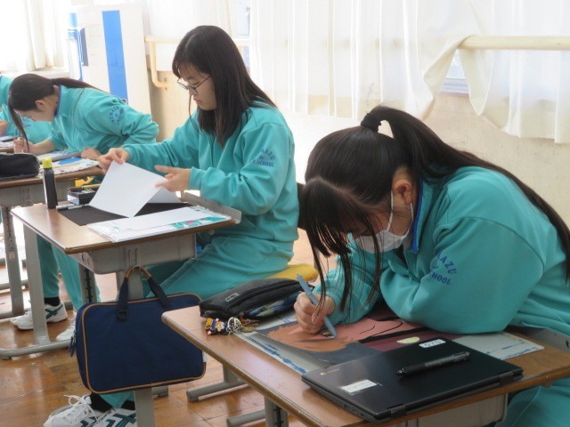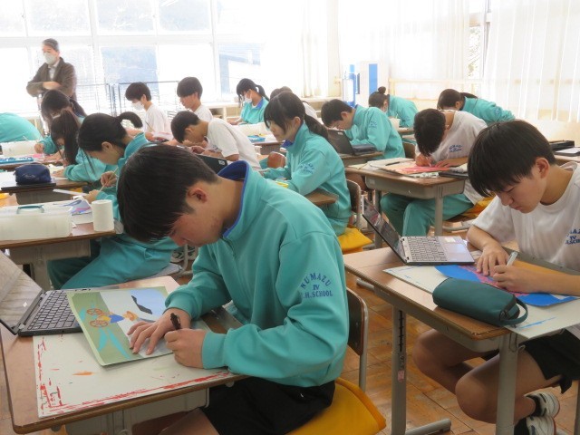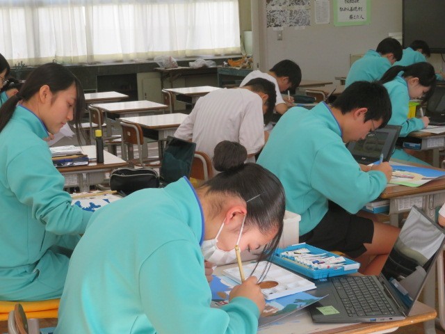 3年A組の美術の時間です。張り詰めた空気の中、着彩を進めています。かなり仕上がってきました。