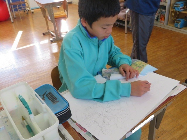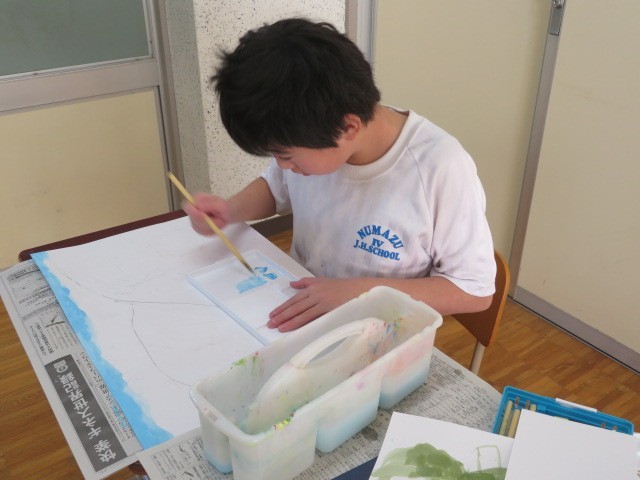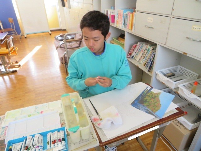 E組の美術の時間です。水彩絵の具を使って、丁寧に色づけをしていきます。