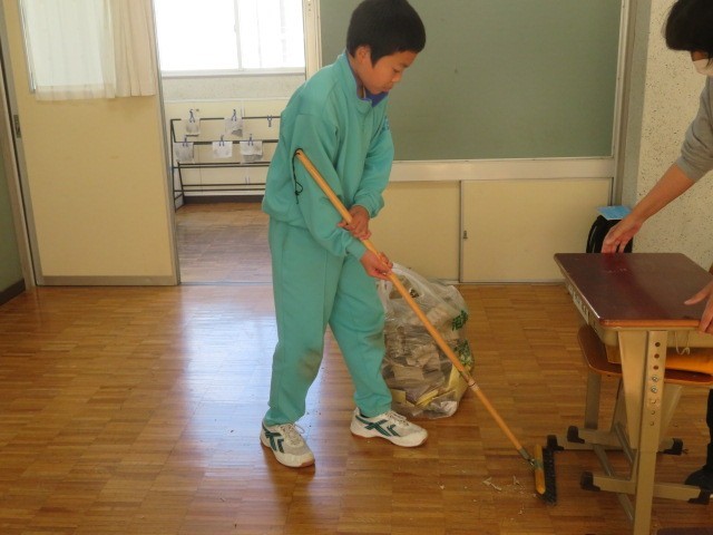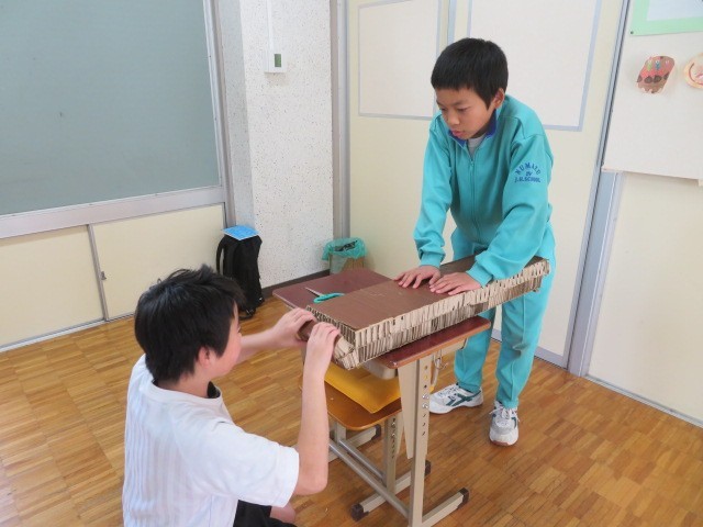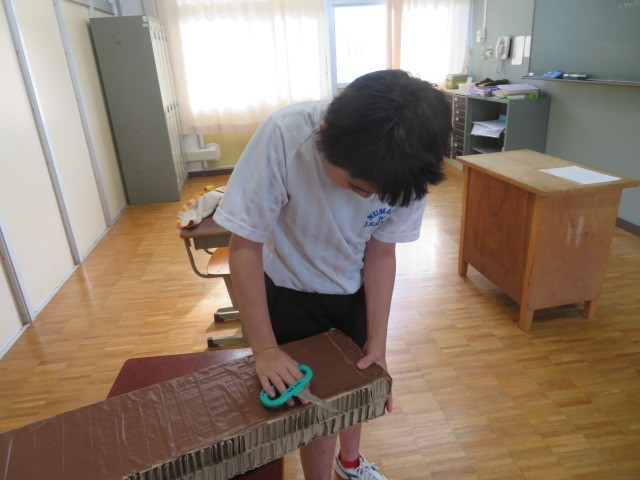 E組で片付け作業を行っていました。劇の大道具として使用した段ボールを廃棄するために小さく分けてつぶしました。協力して作業を進めることができ、よく頑張りました。
