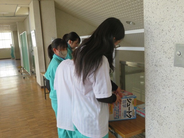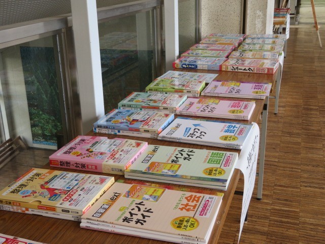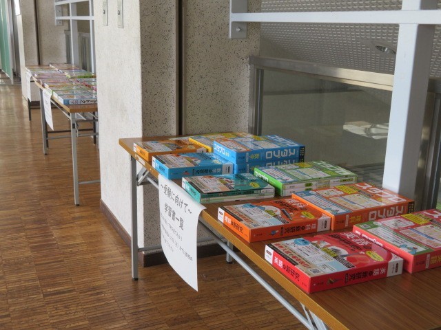 2階中央廊下に、2年生が学力の定着に使用する学習書の見本が展示されています。6種類のそれぞれの教科の学習書、まとめ、基本問題、応用問題などあります。また、冬休み期間にちょうどいい厚さの2年生の5教科の復習、各教科の復習なども展示されていました。昼休みに手に取って見ている生徒さんもいました。