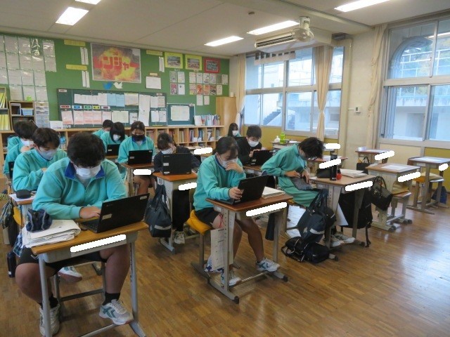 3年C組の社会の時間です。AIドリルを活用して、ここまでの学習の復習を行っています。