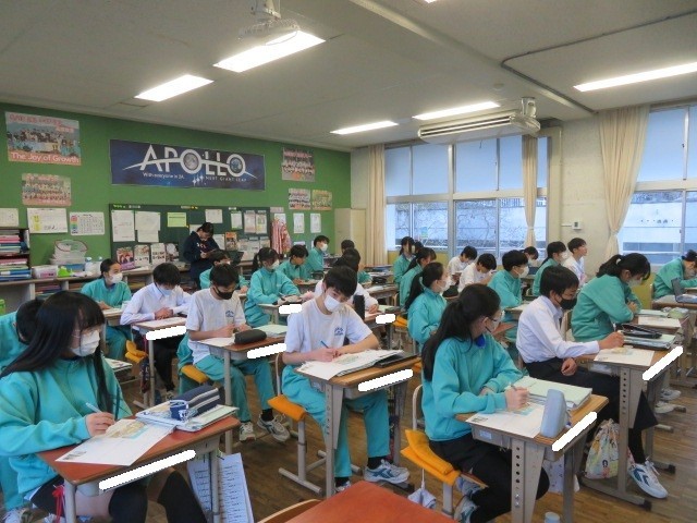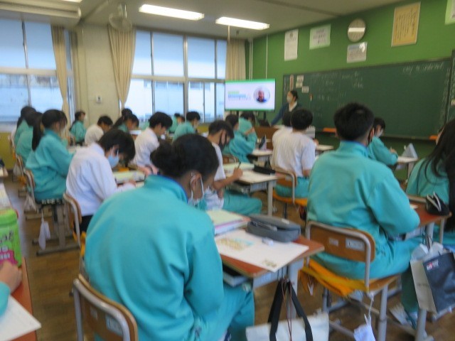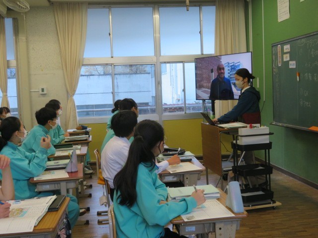 2年A組の英語の時間です。動画から流れ出てくる英文を聴取り理解していきます。聞き取る力が身についています。