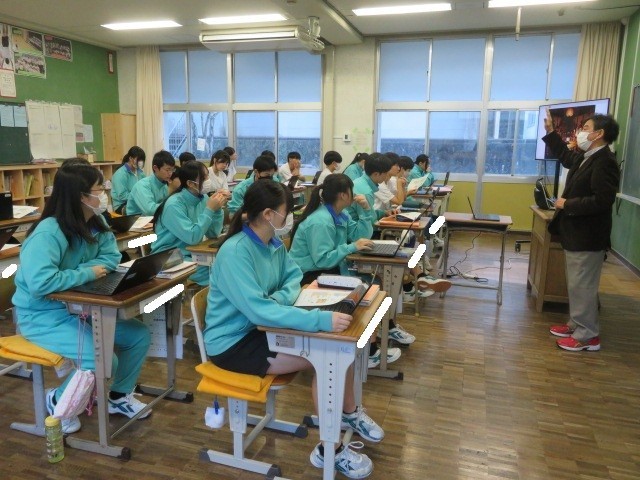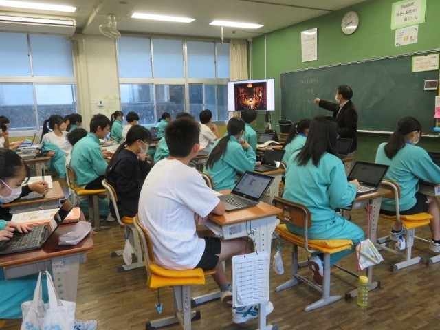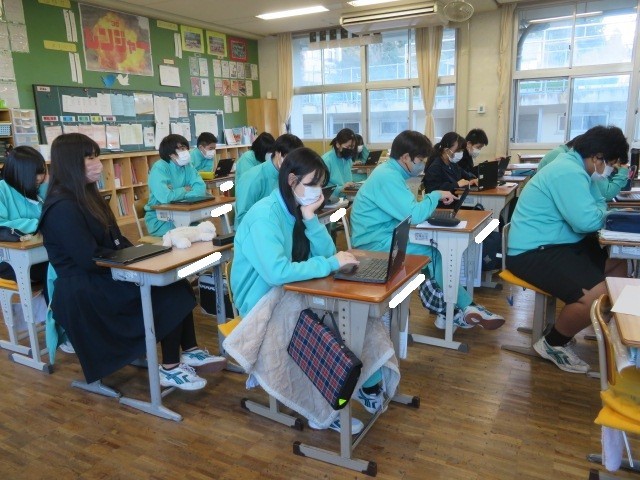 3年A組の技術の時間です。プログラミングでキャラクターを動かし、アニメーションの作成に取り組んでいます。