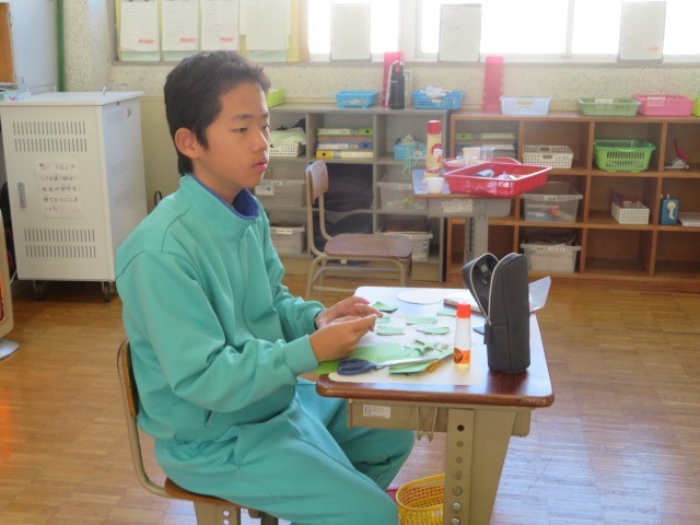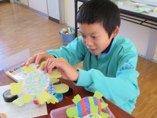 E組作業の時間です。「かめさんタワー」づくりを行っていました。きれいに色づけされたかめさんに、ペットボトルのキャップを取り付けて重ねていきます。バランスの取り方が難しいようです。