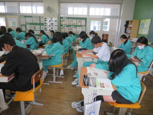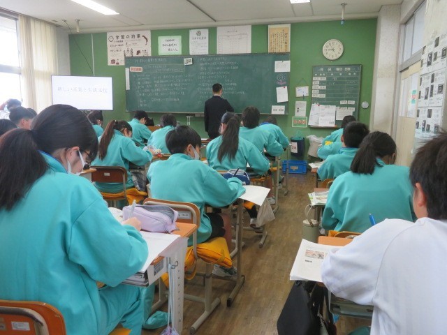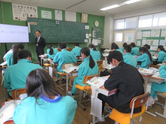 1年B組の社会の時間です。アメリカ合衆国の産業・文化について学習しています。ショッピングセンターの規模の違いなど広大な国土を感じさせます。
