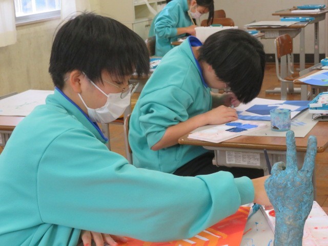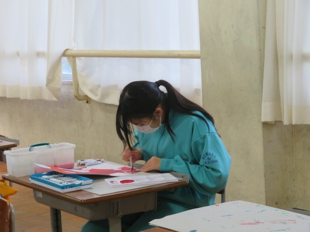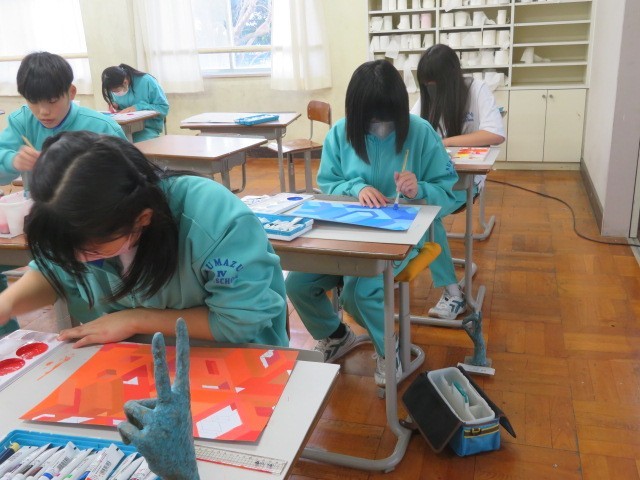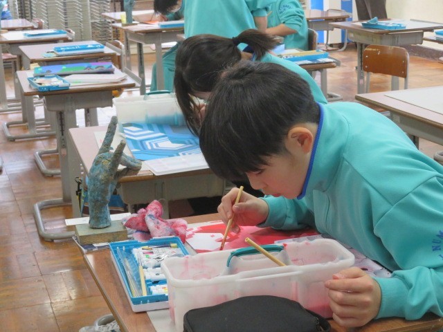 1年A組の美術の時間です。彩色もいよいよ仕上げに近づいてきているようです。集中して活動しています。