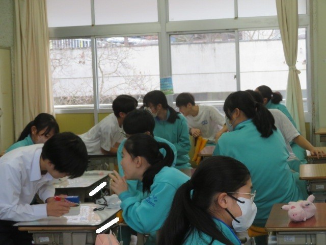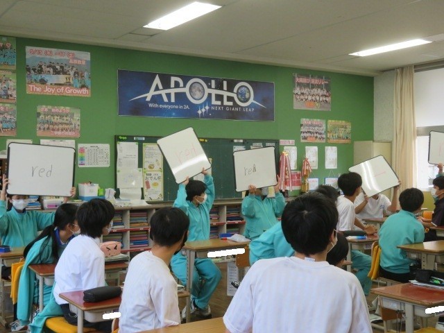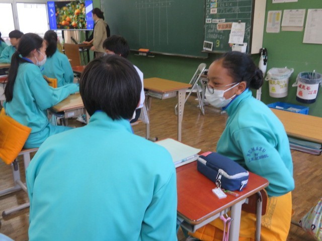 2年A組の英語の時間です。ALTから先生出された問題について、英語の伝言です。英文の理解と正しい発音での伝達を競っていました。