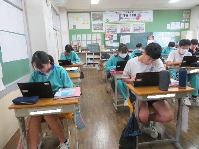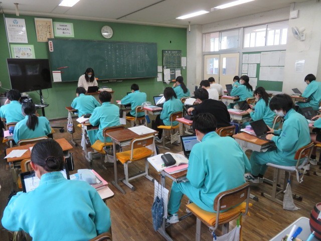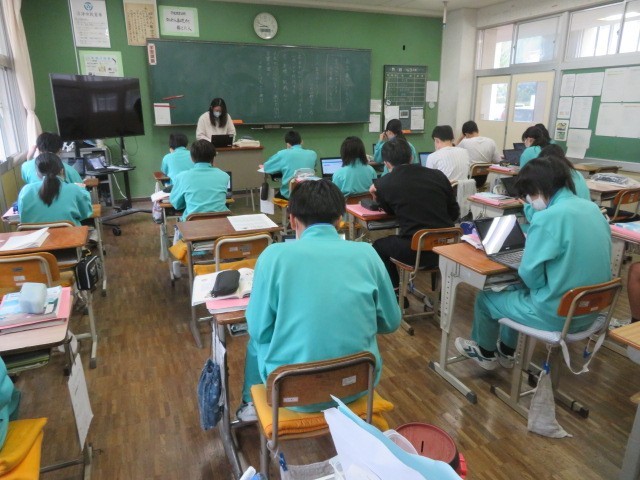 3年B組の国語の時間です。オリジナル名言集の作成に取り組んでいます。進路に向かっての取り組みの中で、自分や仲間を励ましたり支えになったりする名言も期待されます。