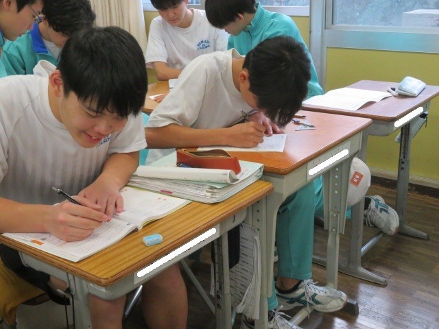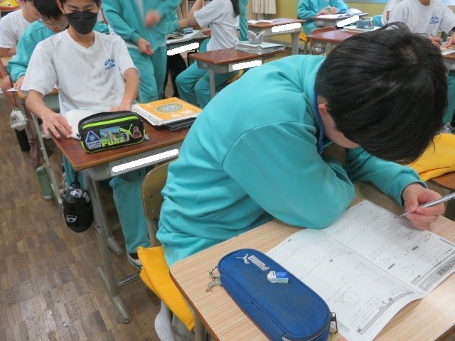 3年A組の数学の時間です。円周角の定理、接線を用いながら証明問題を解いています。