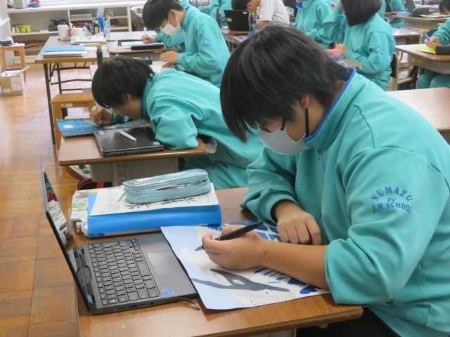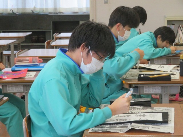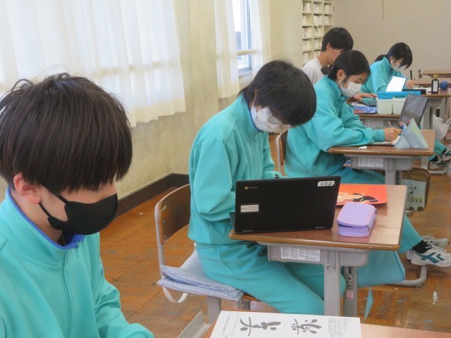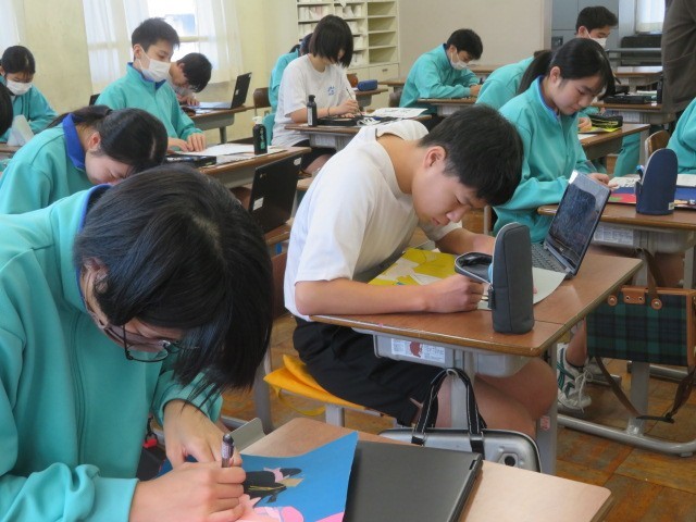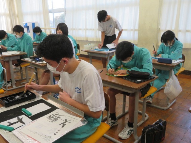 3年B組の美術の時間です。着彩を終えた生徒さんは次の課題「座右の銘」に取り組んでいます。