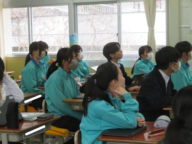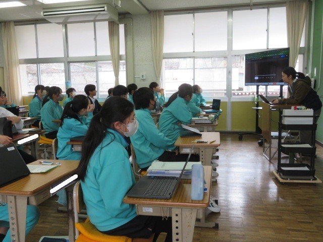 2年A組の英語の時間です。Performancedayの動画を観ています。話されている言葉を聴き取る力はすごいです。