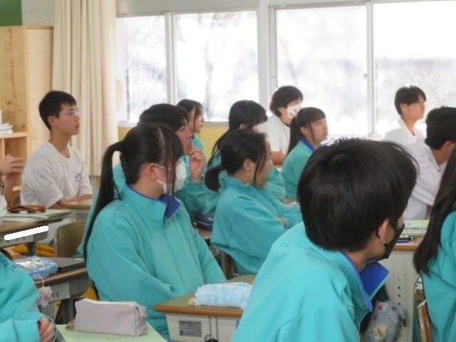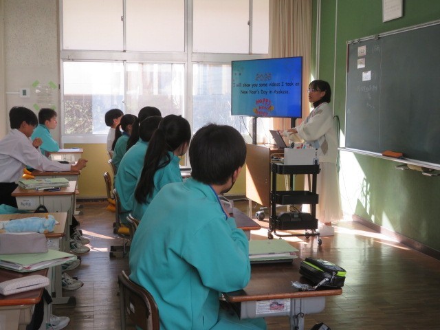 3年A組の英語の時間です。年末年始の出来事について,ALTの先生が動画を交えて紹介していました。英文を聴取りながら、興味深そうに観ていました。