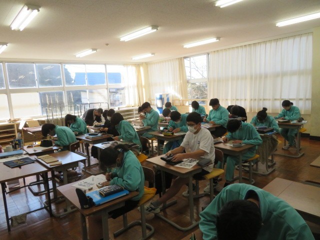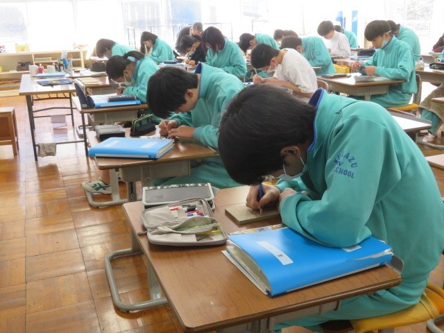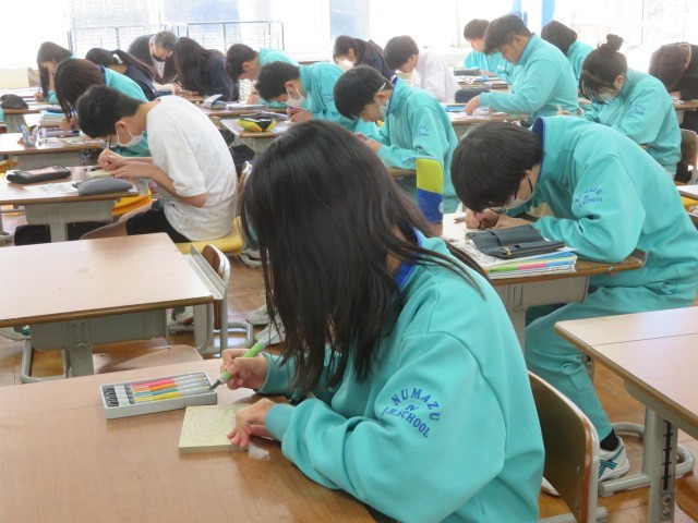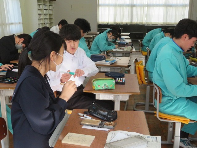 3年C組の美術の時間です。木彫レリーフの制作に取り組んでいます。普段使い慣れない彫刻刀の扱い方について、先生が具体的にお話ししていました。