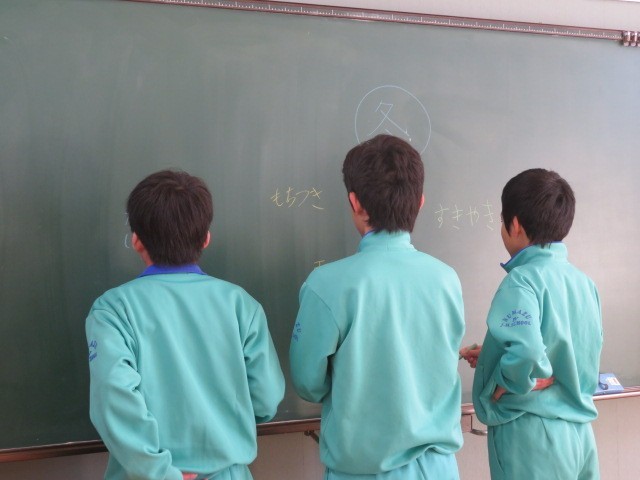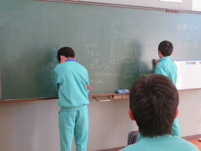 E組で、冬の詩を考えています。まず、冬から思い浮かぶことがらを黒板にいくつも書き出してイメージを膨らませています。