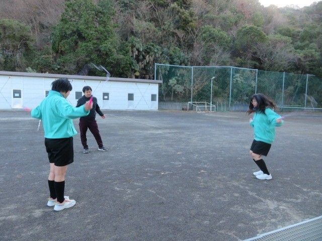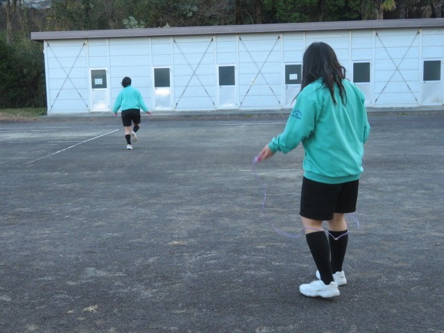 E組の朝運動、縄跳びを行っています。綾跳び、交差跳び、駆け足跳びなどに取り組んでいました。