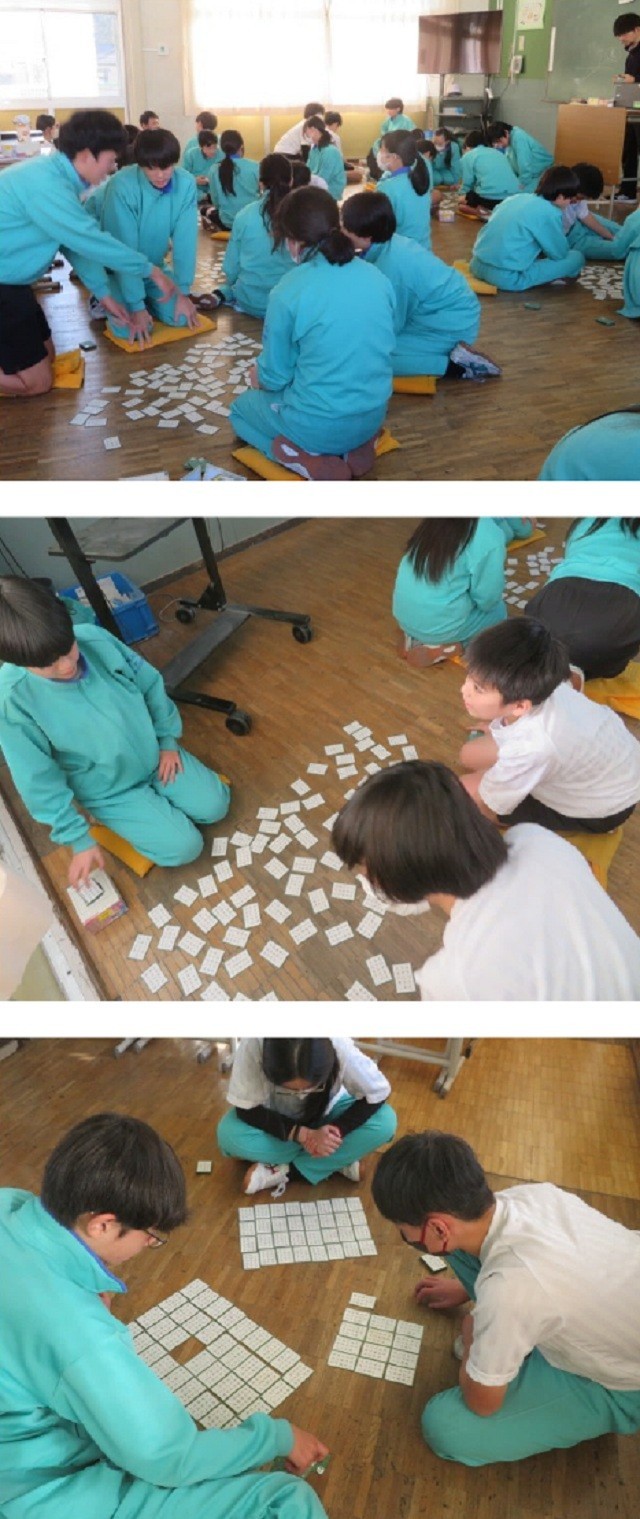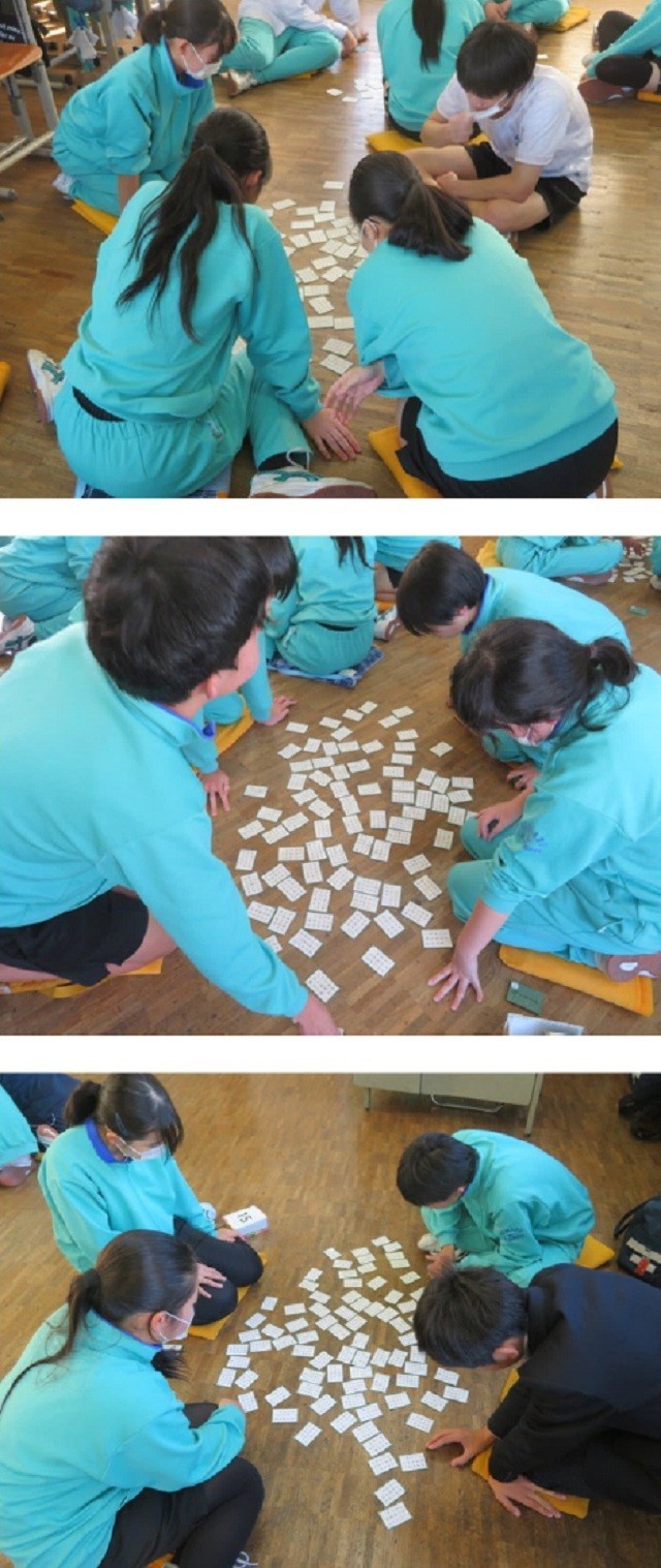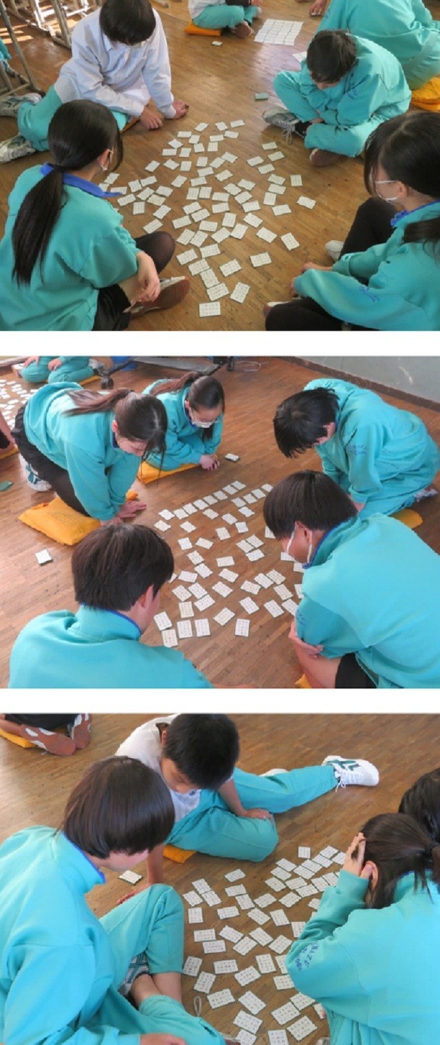 2年B組の百人一首の様子です。担任の先生が読み上げる歌を聞き、懸命に探しています。