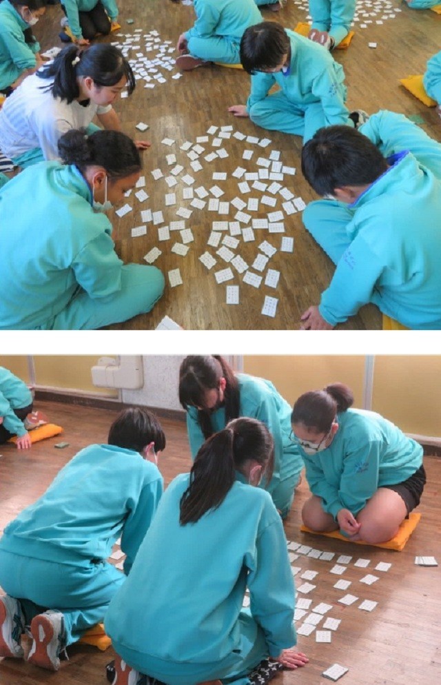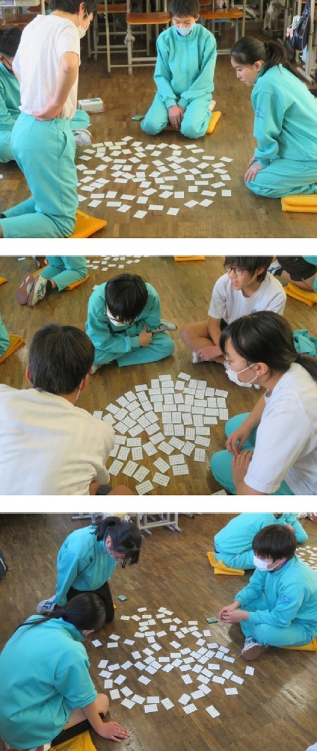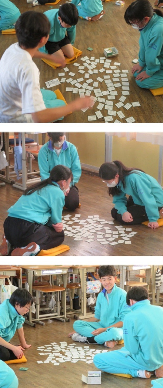 2年A組の百人一首の様子です。取り札に手を伸ばす楽しそうな声が教室に響いていました。