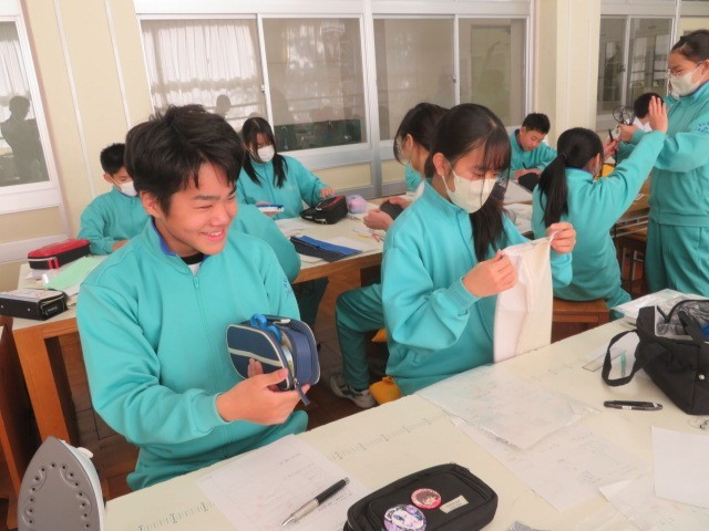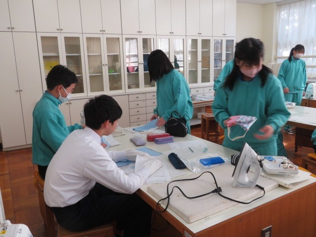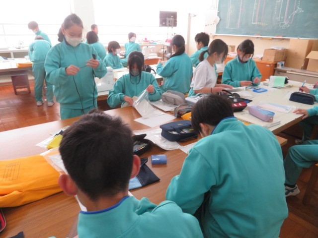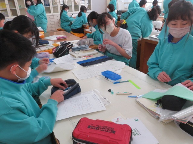 1年A組の家庭科の時間です。カバーの制作も大分進んでいます。片付け作業と授業の振り返りの記入を行っていました。
