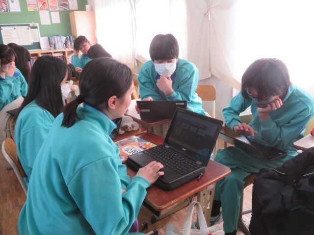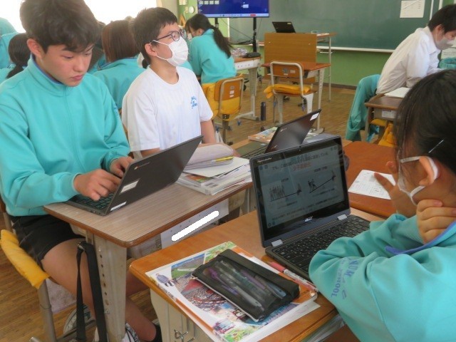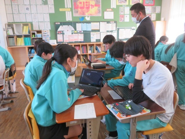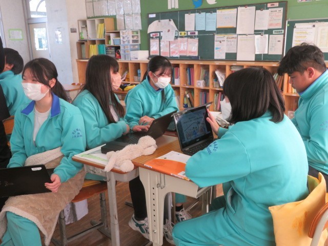 3年C組の社会の時間です。「大きな政府」と「小さな政府」について、意見を交わしています。「高福祉高負担」「低福祉低負担」それぞれのメリットとデメリットを考えています。