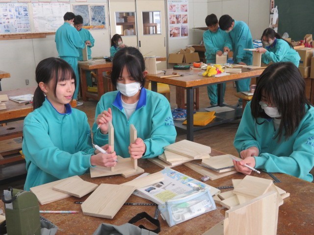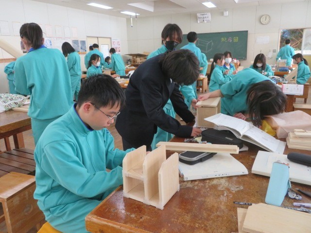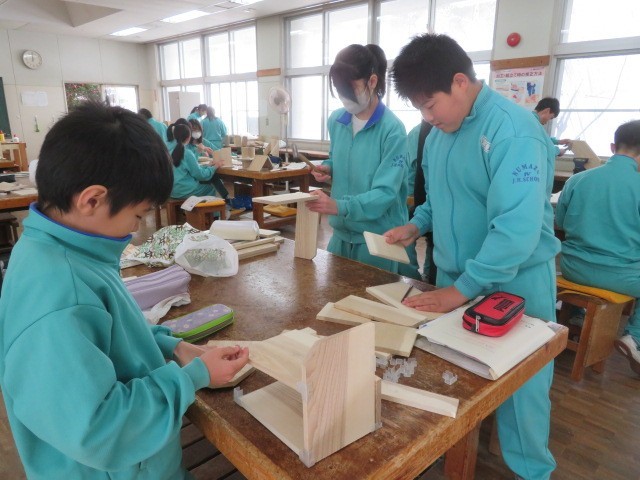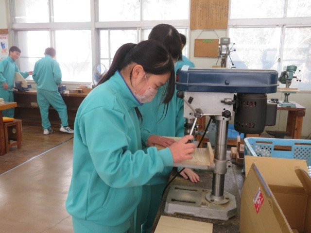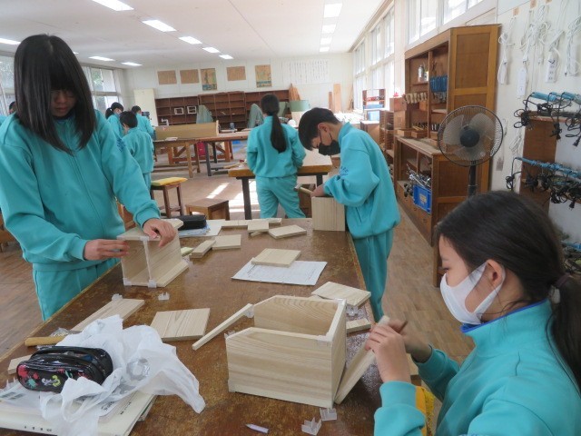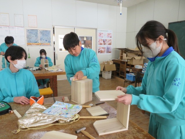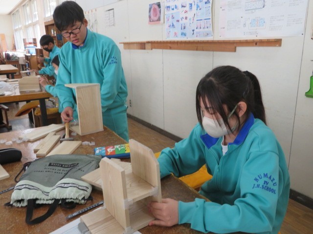 1年B組の技術の時間です。木材加工も完成にどんどん近づいています。最後まで集中して作業に取り組みます。