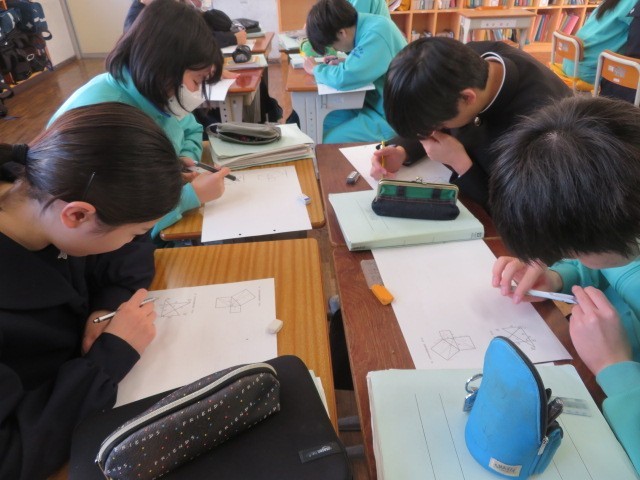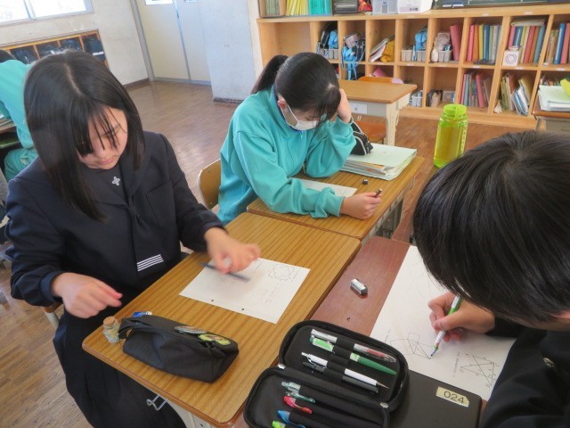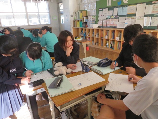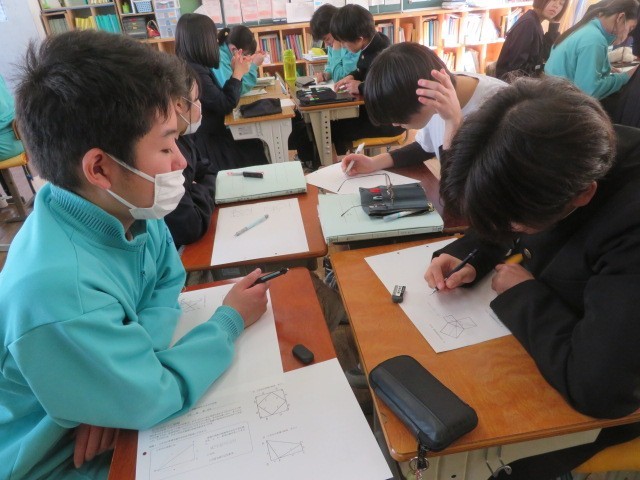3年C組の数学の時間です。三平方の定理の証明に取り組んでいます。プリントの図を前に、考えを絞り出し合っています。