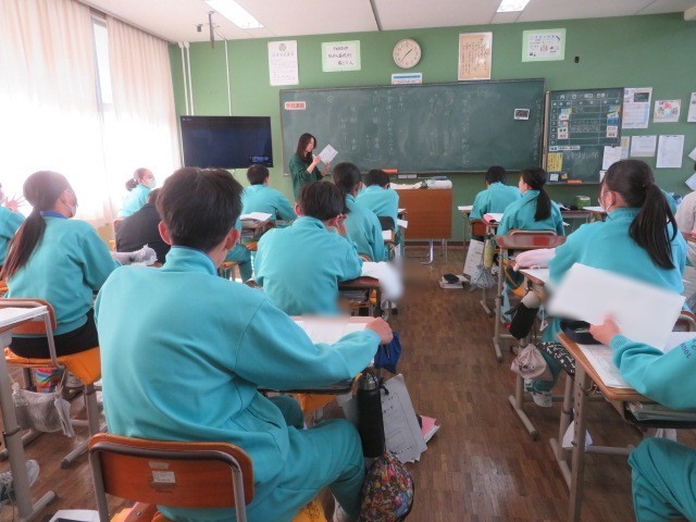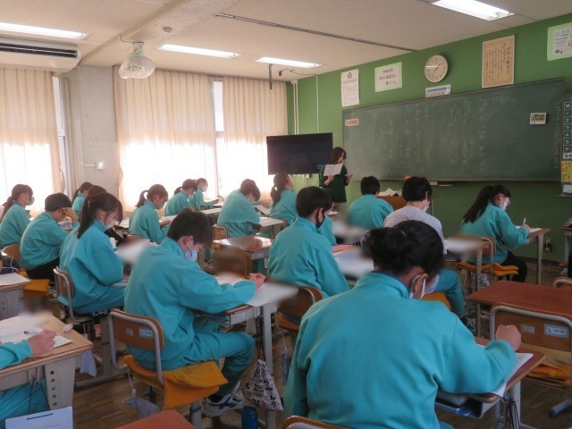 2年A組の国語の時間です。先日行われた学力調査の答案を手に、解答時に中止しなければいけない点などを確認しています。