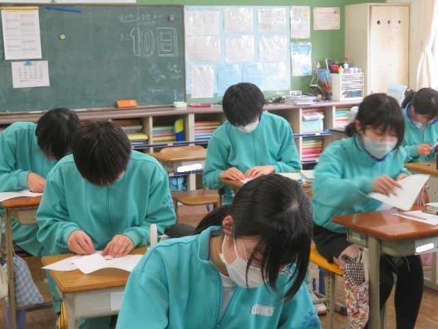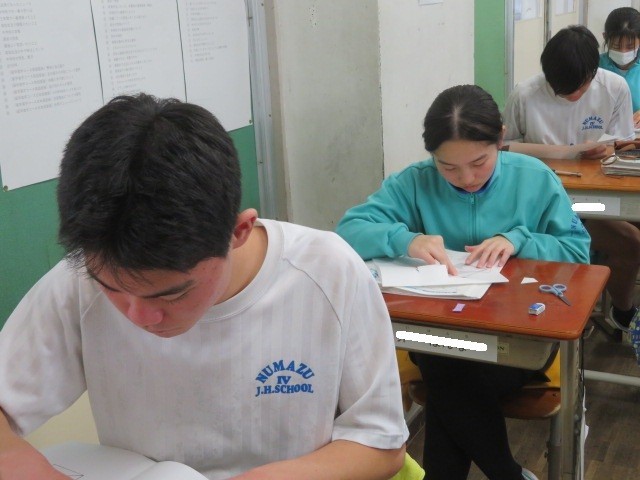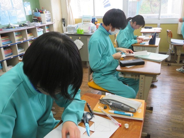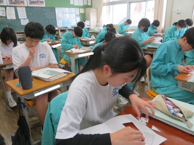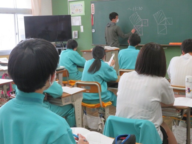 3年B組の数学の時間です。直角三角形の直角を挟む二辺をそれぞれ一辺とする正方形をカットしたものを、斜辺を一辺とする正方形の中に組み込んで三平方の定理を証明していきます。