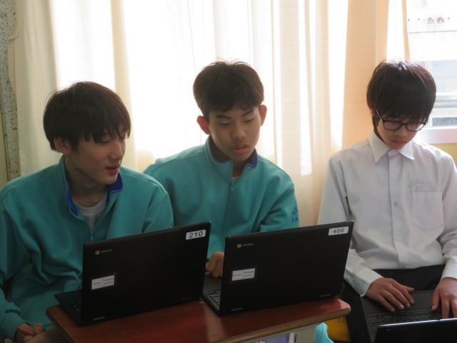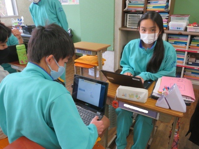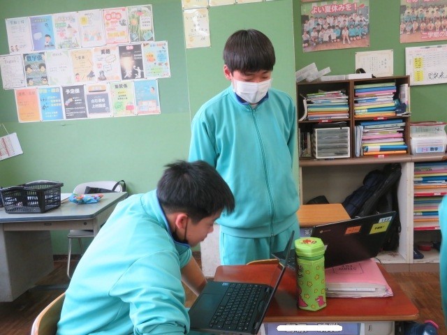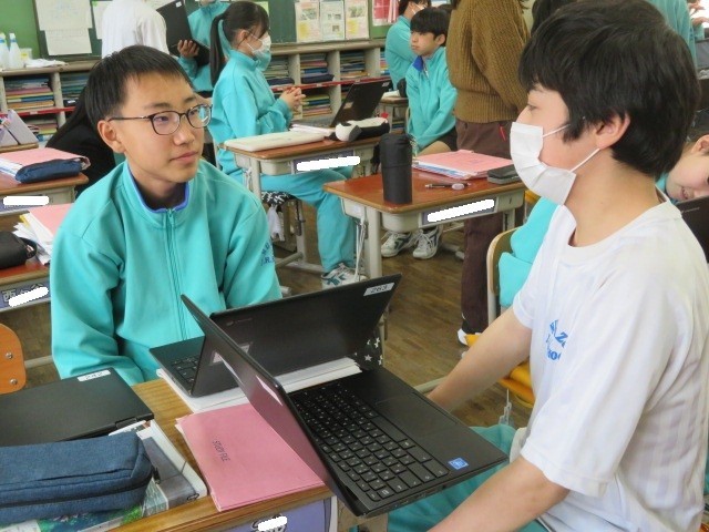 2年A組の国語の時間です。それぞれが考えたスピーチを校正して、完成度を高めています。