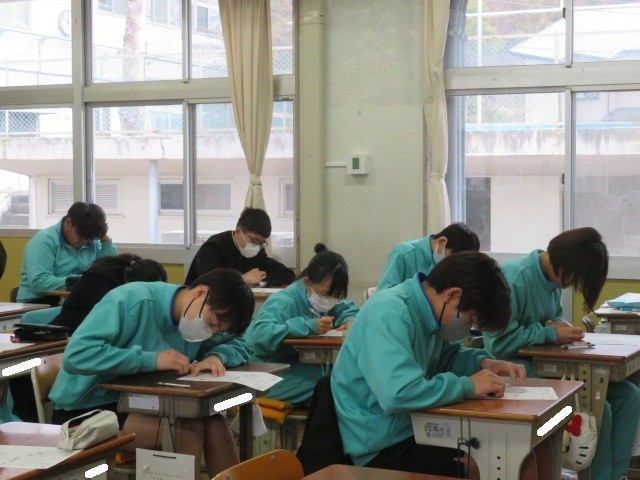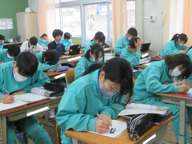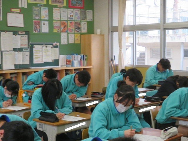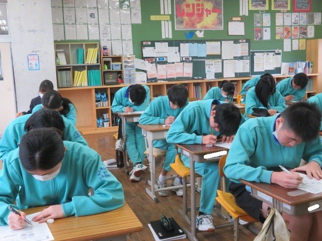 3年C組の社会の時間です。「暮らしと経済」の学習診断に取り組んでいます。