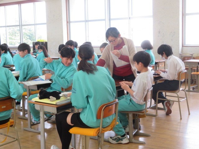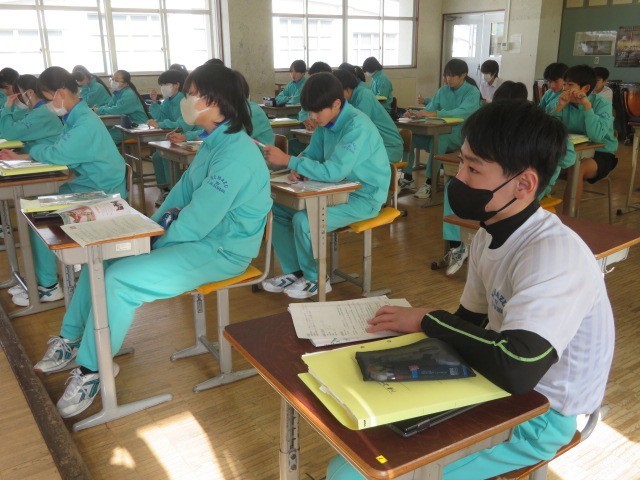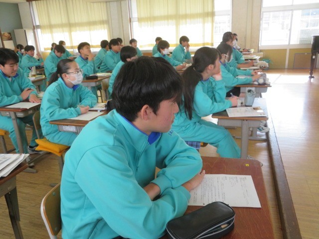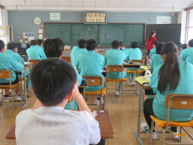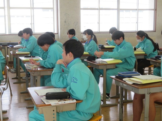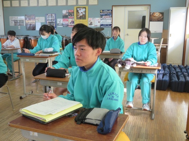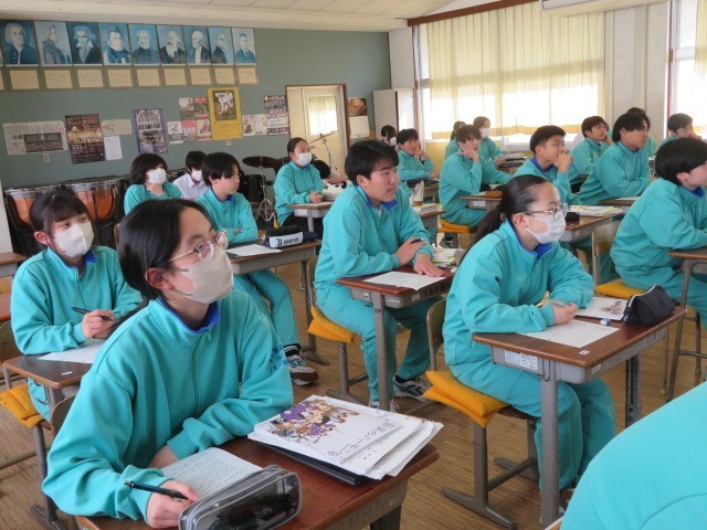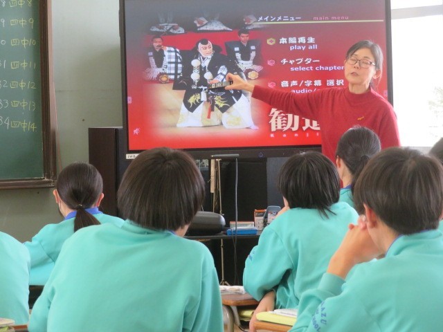 2年B組の音楽の時間です。「勧進帳」の登場人物について、歴史的な表現も含め確認しています。義経が安宅の関を通過する有名な場面、しっかりと見ておきたいですね。
