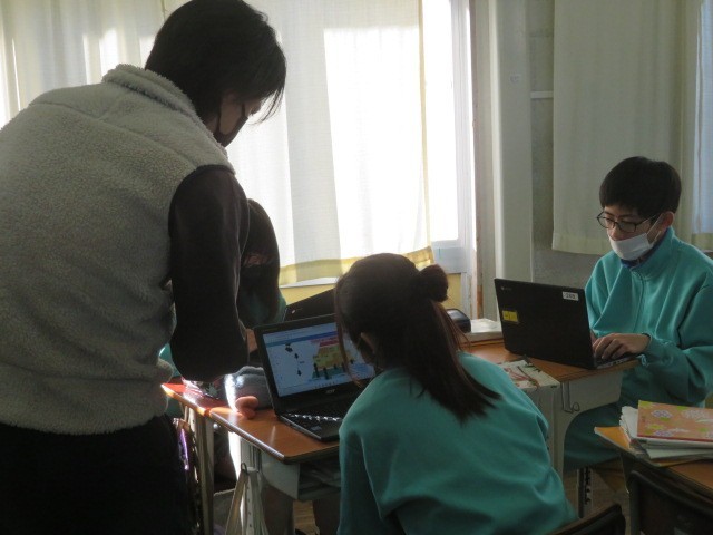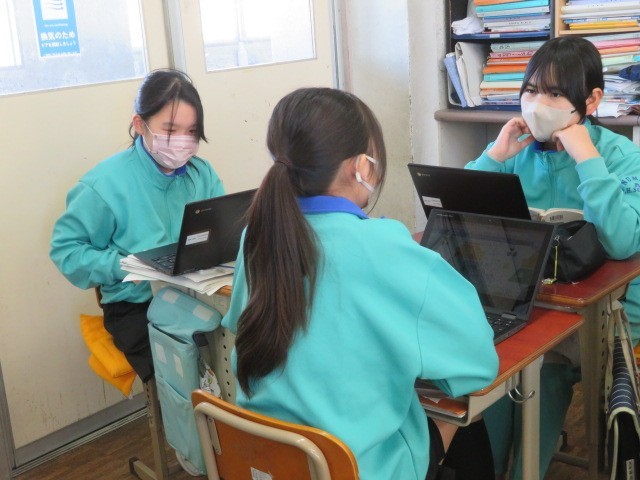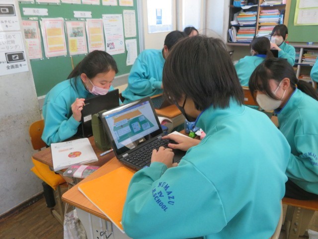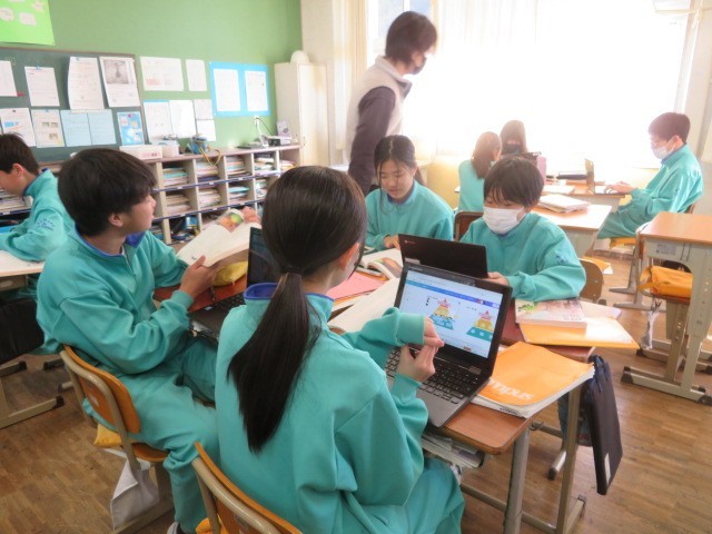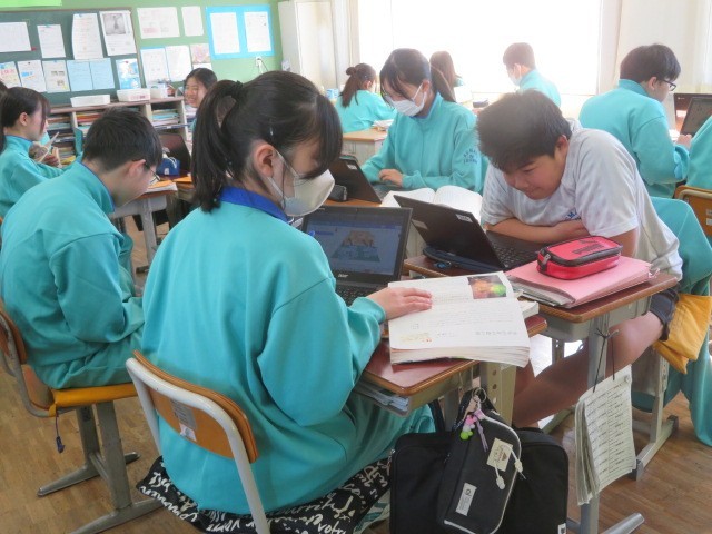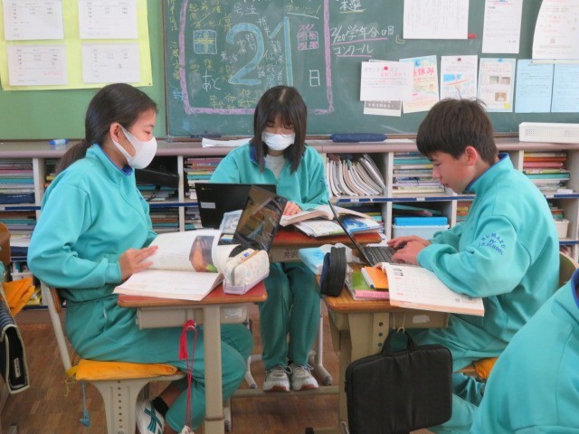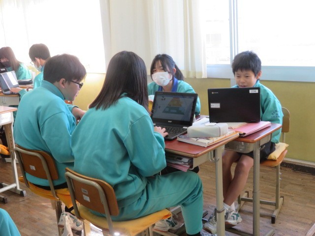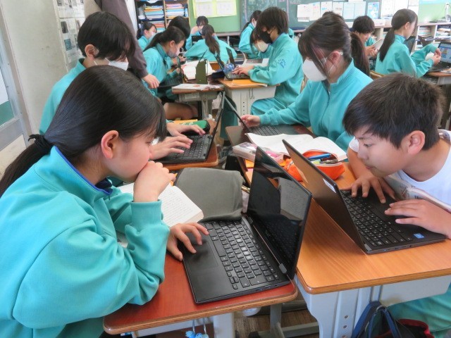 1年B組の国語の時間です。『少年の日の思い出』について、ピラミッドチャートを作成して整理しています。