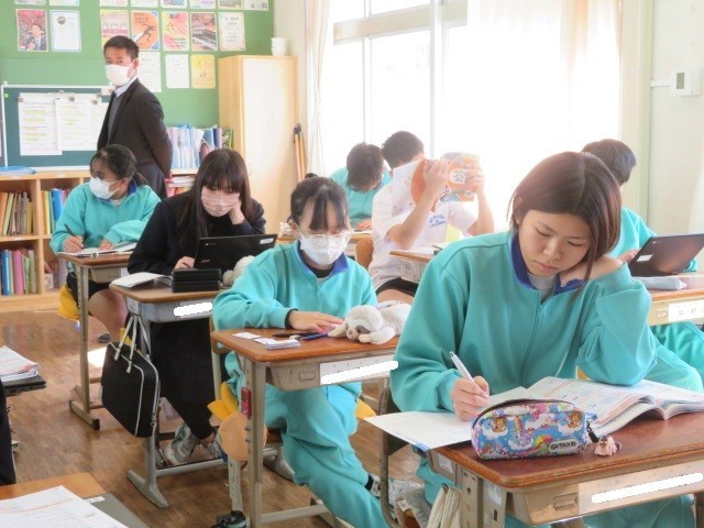3年C組の社会の時間です。まとめの時期、試験を前に集中度も高まっています。