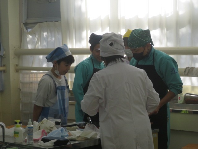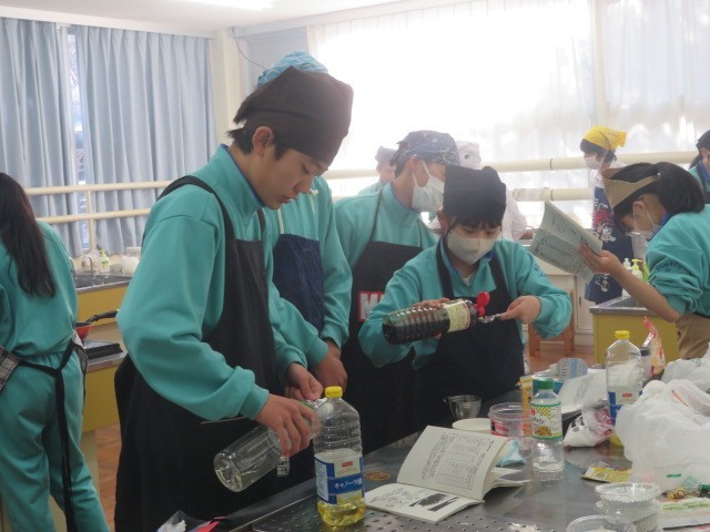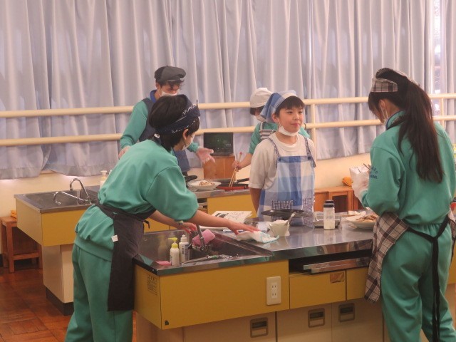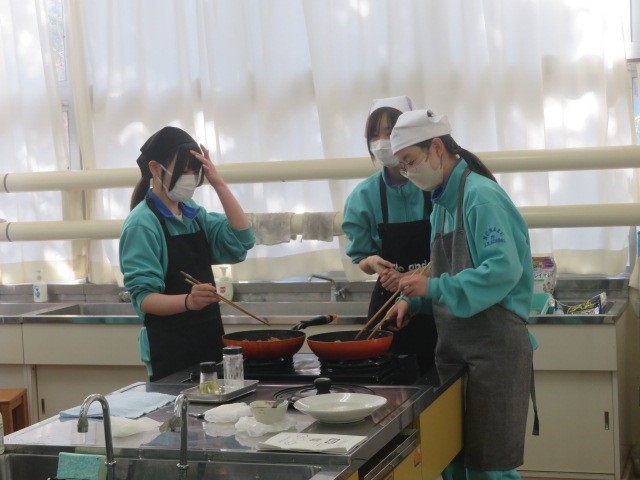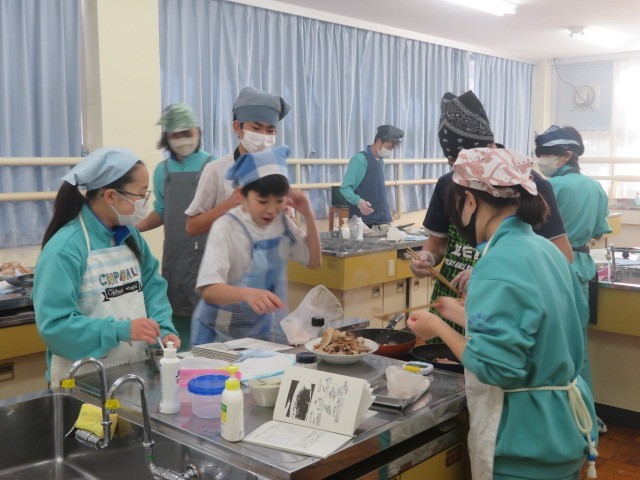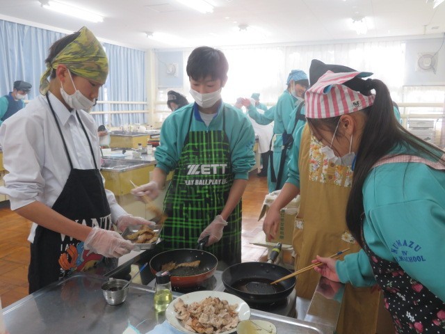 2年B組の家庭科の時間です。豚肉の生姜焼きに挑戦です。食欲をそそるしょうがの香りがします。ぜひ家庭でも挑戦してみるとよいですね。
