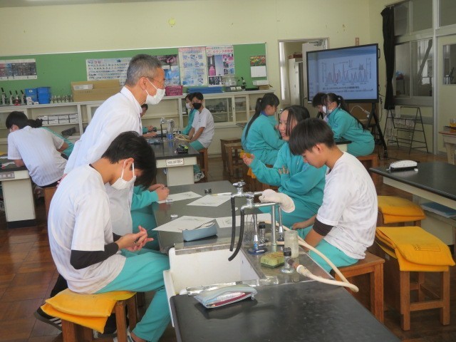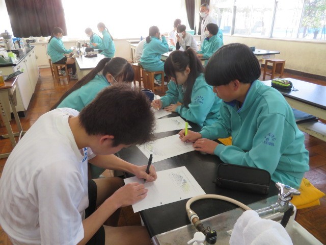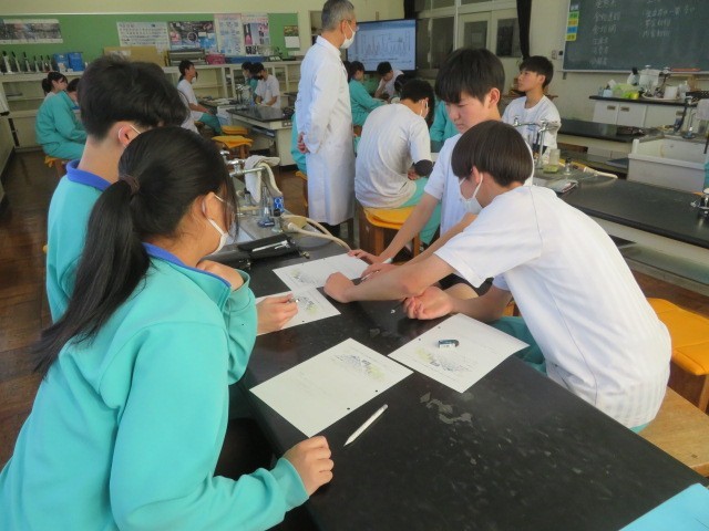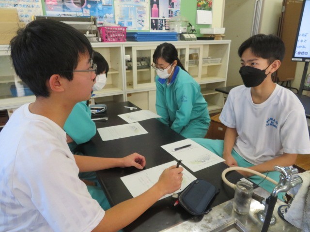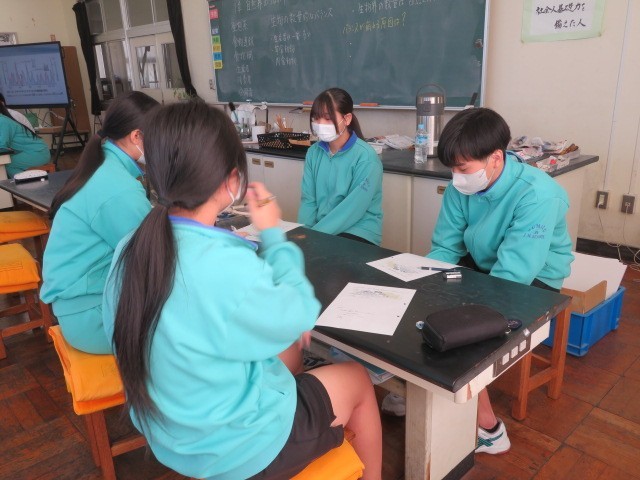 3年A組の理科の時間です。生態数の変化、動物の個体数のバランスなどについて考えています。バランスが崩れる要因について、グループで意見交換をしています。