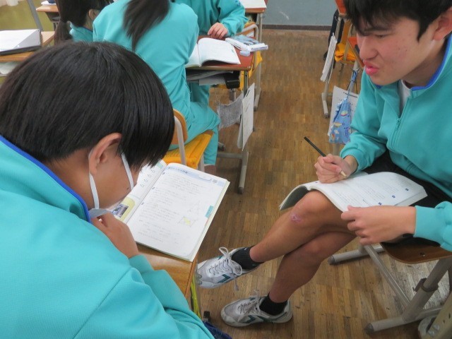 2年B組の数学の時間です。まとめの問題など、やり方を教えたり、教えられたりしながら学習しています。